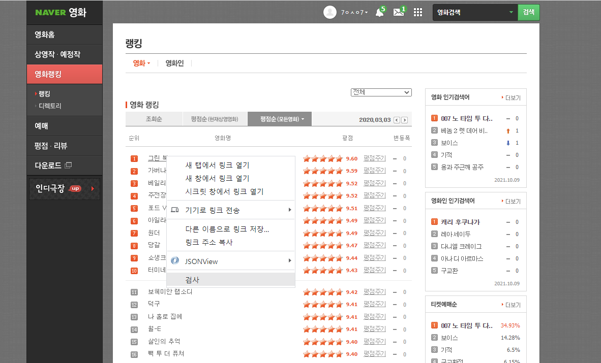 영화 제목에 커서를 대고 마우스 우클릭 -> 검사 에 들어간다.