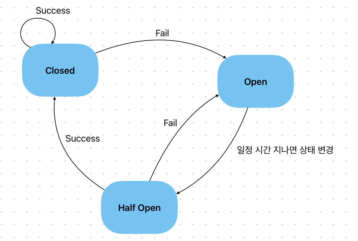 Half Open: Open 상태가 되고 일정 시간이 지난 상황, 일부 허용된 요청들이 성공할 경우 Closed상태로 전환