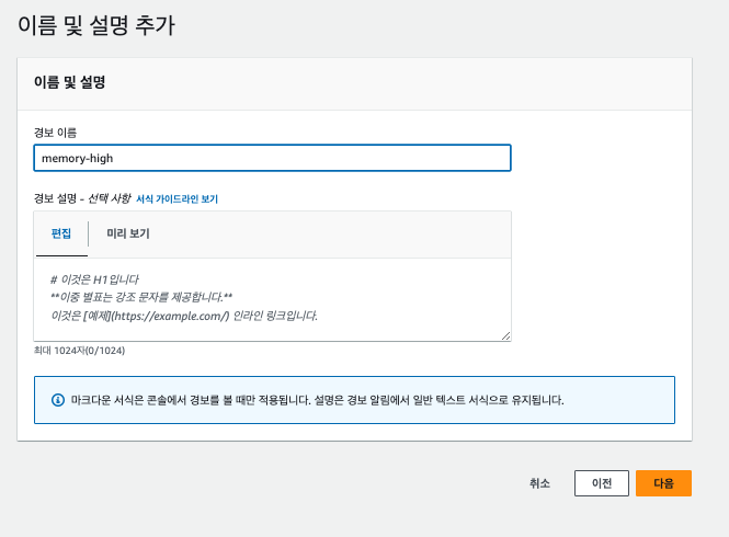 이제 알림을 발생시키고자 모니터링을 할 경보를 설정해준다.