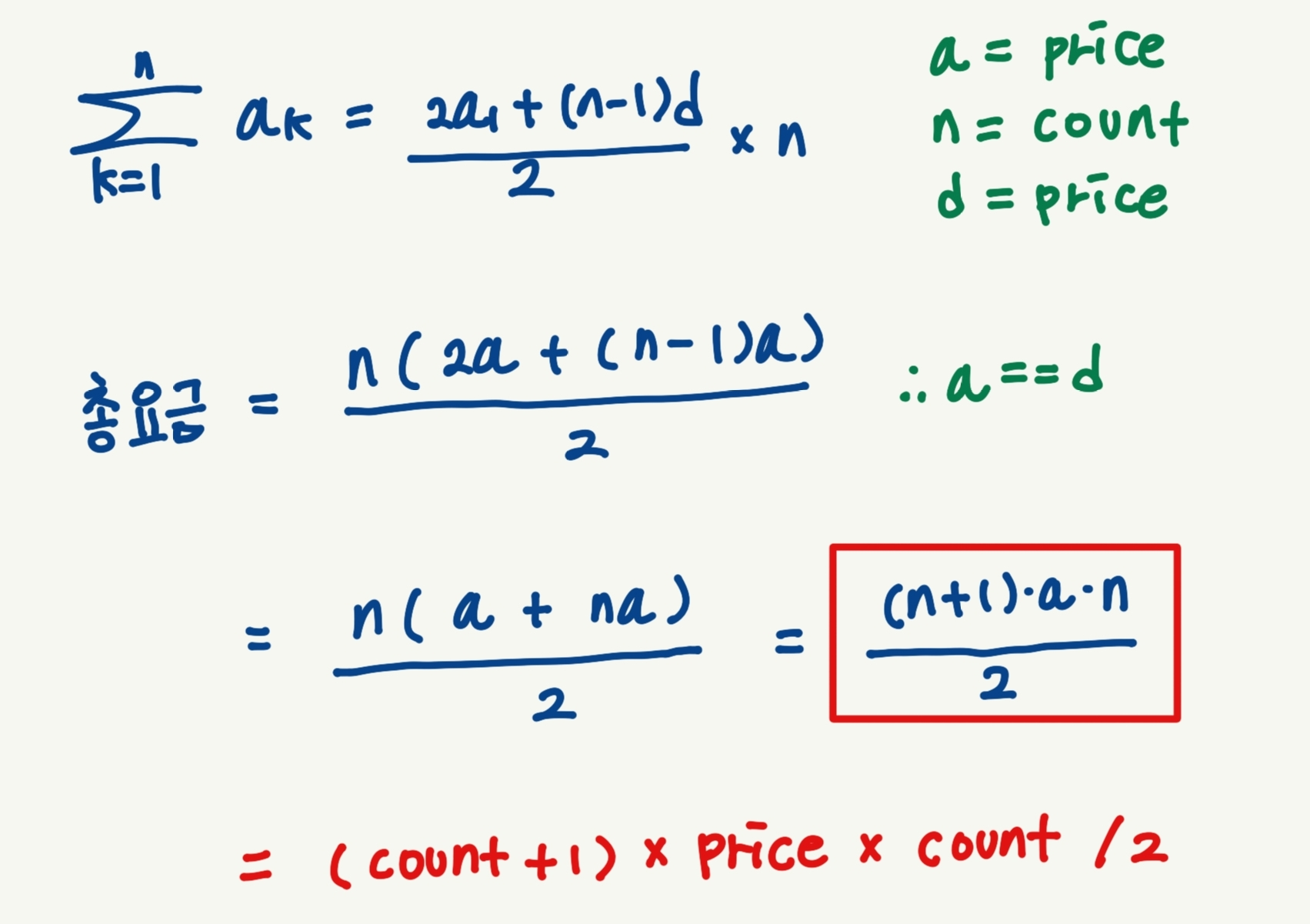 등차 수열의 공식을 이용하여 요금의 합을 구하고