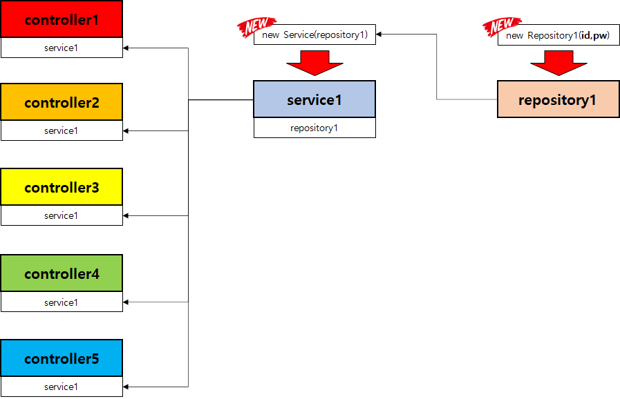 Controller 5개가 Service1을 생성하여 사용 중일 때, 만약 Repository1 생성자를 변경하고자 한다면..
